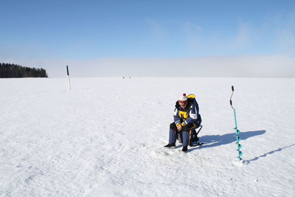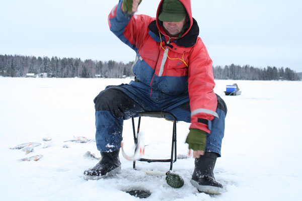 Monofil-siiman vahvuus on vähintään 0,26 mm. Jouko aloittaa tasapainon uittamisen 6-7 pahlan kiepautusta eli noin 4 metriä pohjasta. Viehettä uitetaan koko ajan nykäysten voimaa ja laajuutta vaihdellen. Pilkkiä voi myös hieman täristää. Vesikerros kalastetaan alas saakka ja käydään välillä pölläyttämässä pohjaa. Sitten tasuria lähdetään nostamaan uudestaan ylöspäin. Joskus isot ahvenet löytyvät aivan jään alta. Vesikerros pohjasta muutama metri ylöspäin on yleensä kuitenkin se alue, mistä tärppi tulee. Iso ahven ei useinkaan ota ihan heti, joten yhdellä avannolla kannattaa onkia aika pitkään. Kun ensimmäinen kala on saatu ylös, tasapaino lasketaan takaisin samalle korkeudelle. Iso ahven tulisi saada tarttumaan kerralla kiinni, sillä jos kalan karkuuttaa tai ahven saa pahasti leuoilleen, avanto voi hiljentyä välittömästi. |